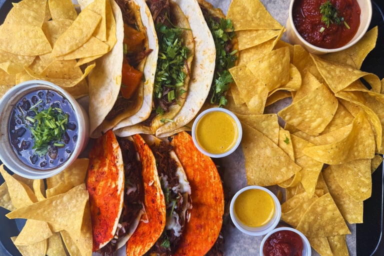 4 Tacos de Birria o Al Pastor con un side de nachos, cilantro, cebolla y queso.